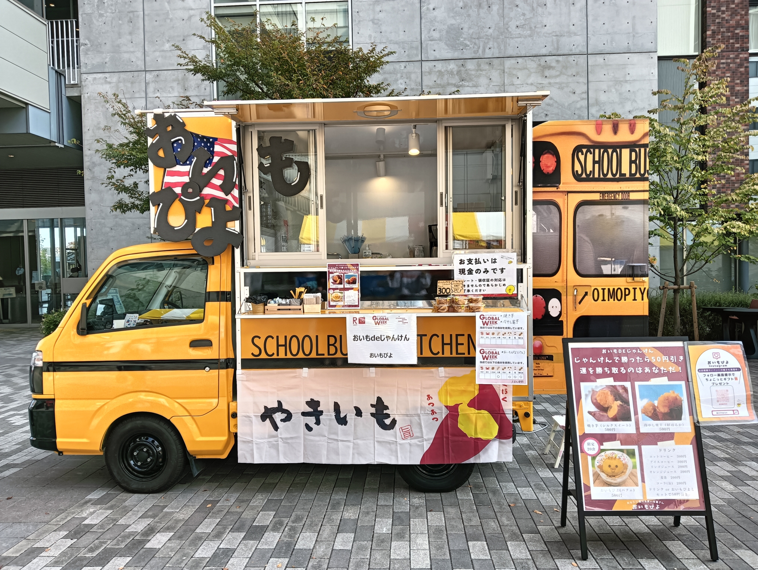 黄色のアメリカンスクールバスキッチンカーにて焼き芋をメインに気持ちも温かくなるメニューをご提供します。